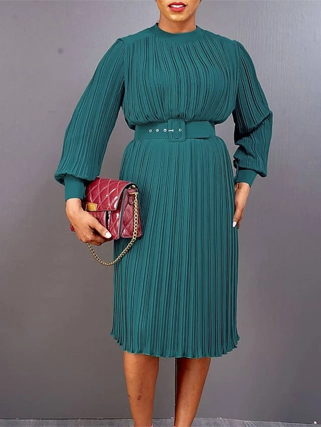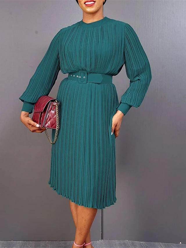 Women’s Work Dress Casual Dress Black Dress Fashion Office Daily Workfashion Midi Dress Lace Up Pleated Crew Neck Long Sleeve Plain Regular Fit Black White Red Fall Winter S M L XL XXL