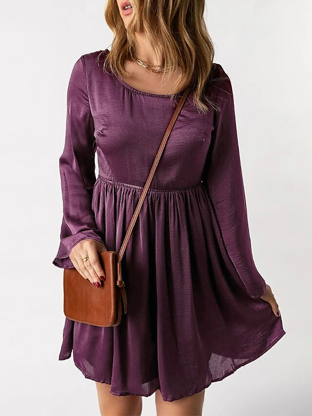 Women’s Work Dress Casual Dress Sheath Dress Fashion Winter Dress Daily Mini Dress Lace Ruched Crew Neck Long Sleeve Plain Regular Fit Purple Fall Winter S M L XL