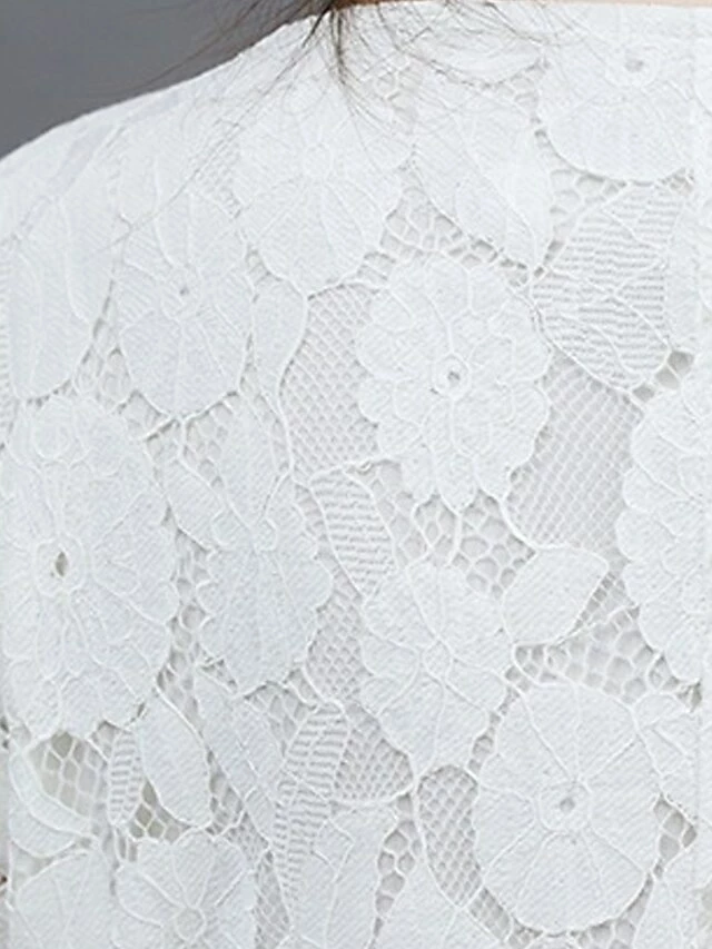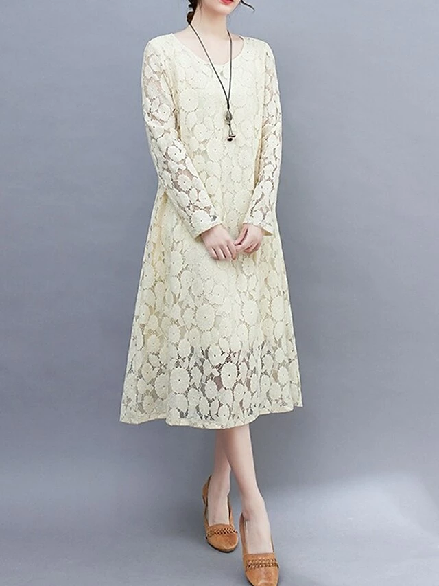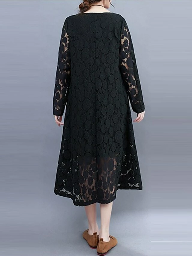 Women’s Work Dress Lace Dress Black Dress Fashion Midi Dress Lace Pocket Crew Neck Long Sleeve Plain Loose Fit Black White Pink Fall M L XL XXL 3XL
