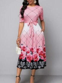 Women’s Work Dress Semi Formal Dress A Line Dress Elegant Midi Dress Lace Up Print Crew Neck Short Sleeve Floral Plaid Regular Fit Pink Summer Spring S M L XL XXL